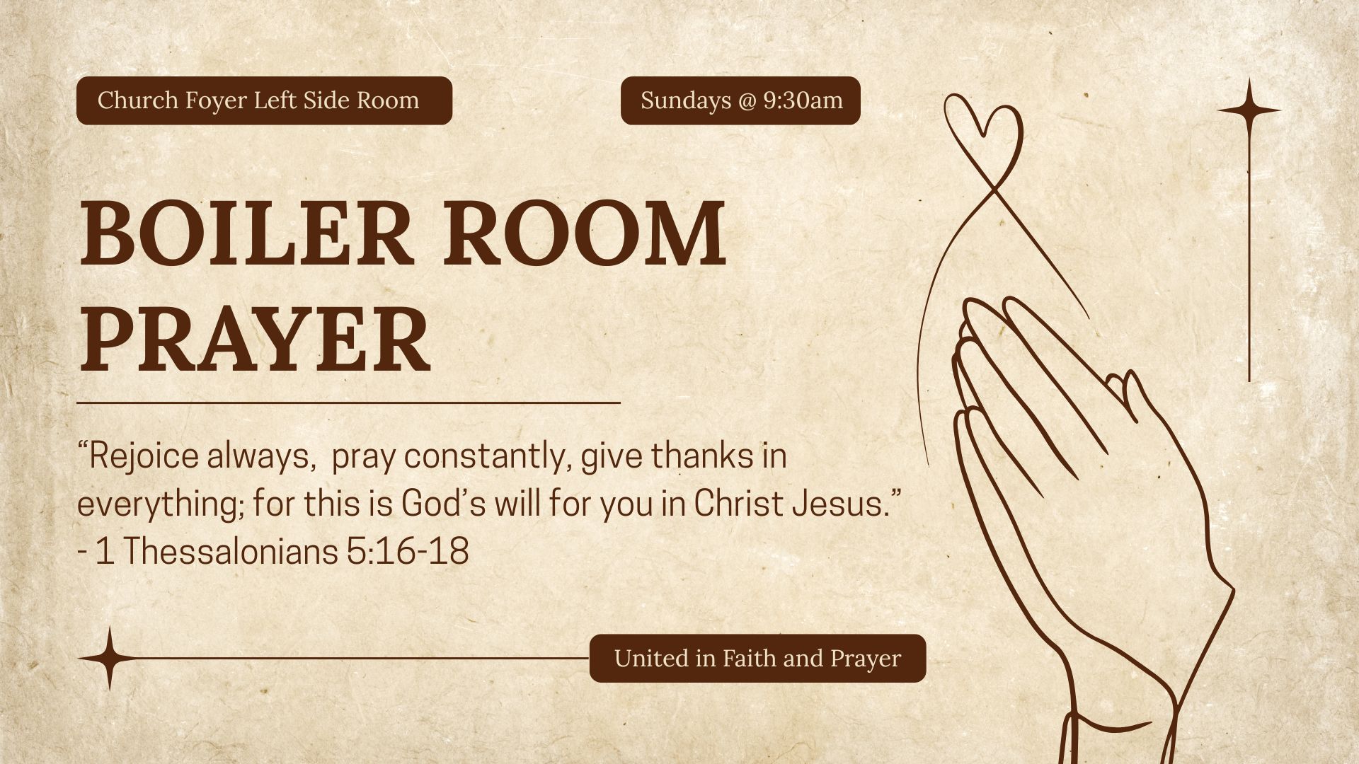 Charles Spurgeon identified the Boiler Room of Prayer, where people would gather to pray for the upcoming church service, the needs of the church, our community, and around the world.